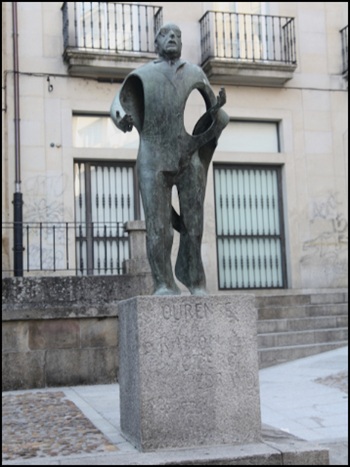 En 1978, dos años después del fallecimiento del escritor, el Ayuntamiento de Ourense decide rendirle homenaje erigiéndole una estatua. Se discute sobre el lugar y se convoca un concurso de ideas que queda desierto. El consistorio ante esta situación, delega en el Patronato Otero Pedrayo que opta por el escultor Buciños y se elige la plaza del Corregidor para su ubicación. Al estar esta sin remodelar se coloca provisionalmente en la Alameda, causando esta decisión un disgusto al artista que ve “empequeñecer” su obra en un lugar inapropiado. Al cabo de cinco años, en 1988, y coincidiendo con el Día das Letras Galegas se procede a una reinauguración del monumento ahora ya en la plaza del Corregidor. Si la primera inauguración estuvo deslucida por el tiempo y la escasa presencia de autoridades y público, la segunda contó con un elevado número de personalidades. La escultura desde el punto de vista formal responde, en boca de su autor, al deseo de hacerlo cercano, a la altura del viandante, no a la manera tradicional, pero que sea reconocida por el pueblo. Una figura puente que entronque lo tradicional y lo moderno, a la vez que recoja esencia de esa gestualidad de la que hablábamos.