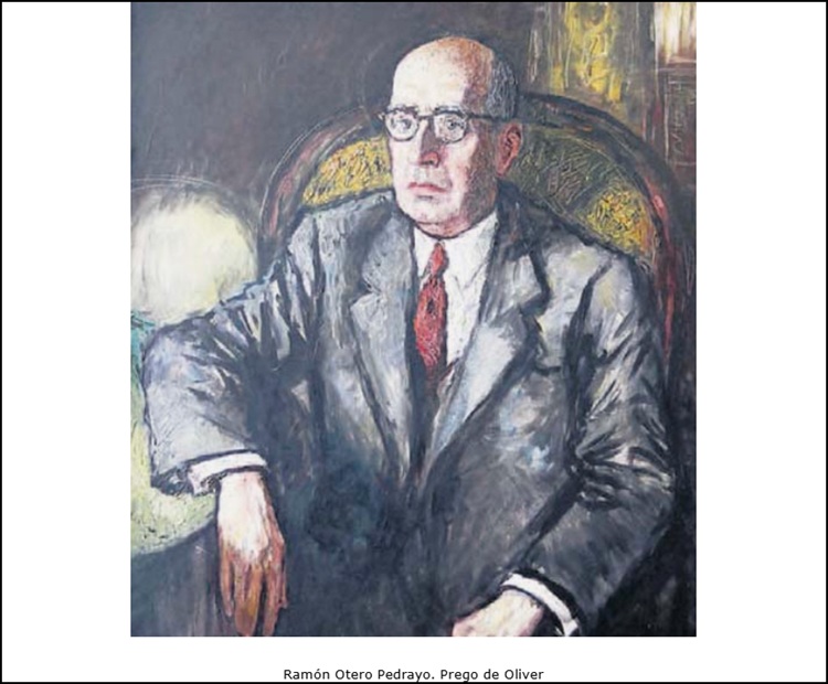 Su faceta de orador, que acompañaba de una gestualidad muy enfatizada y personal, ha sido la que más ha contribuido a definir en el arte el aspecto formal de sus retratos. Sin embargo, el que realizó el pintor ourensano Prego de Oliver para la galería de retratos de directores del IES Otero Pedrayo, primer instituto que se construyó en la ciudad a finales del siglo XIX, no se cumple la premisa de la gestualidad al tratarse en esta ocasión de una obra más academicista por el lugar al que iba destinado y en consonancia con las ya existentes. Prego de Oliver fue un pintor orensano autodidacta, que gozó de reconocimiento sobre todo en los años setenta-ochenta del siglo pasado. Su temática era diversa, pero con un interés por lo cotidiano, los niños y los bodegones, también fue demandado en el campo del retrato realizando tres de los que ocupan la galería del citado instituto. En el que nos ocupa, además de la pose sedente y academicista, se aprecia varias características de su estilo, como el gusto por la luz y las transparencias, los fuertes contrastes entre luminosidad y oscuridad o dibujo y mancha.