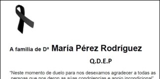Agradecemento da familia de Dª María Pérez Rodríguez